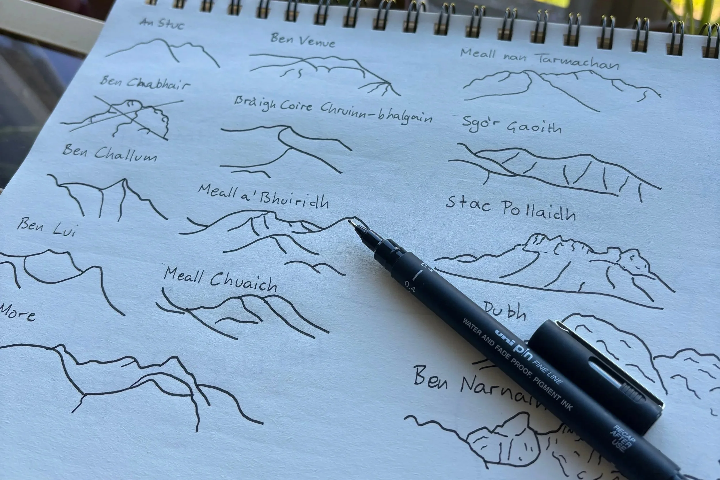 Each table was named after a Munro they’d climbed together, with simple line drawings of each mountain used across the table numbers and plan.